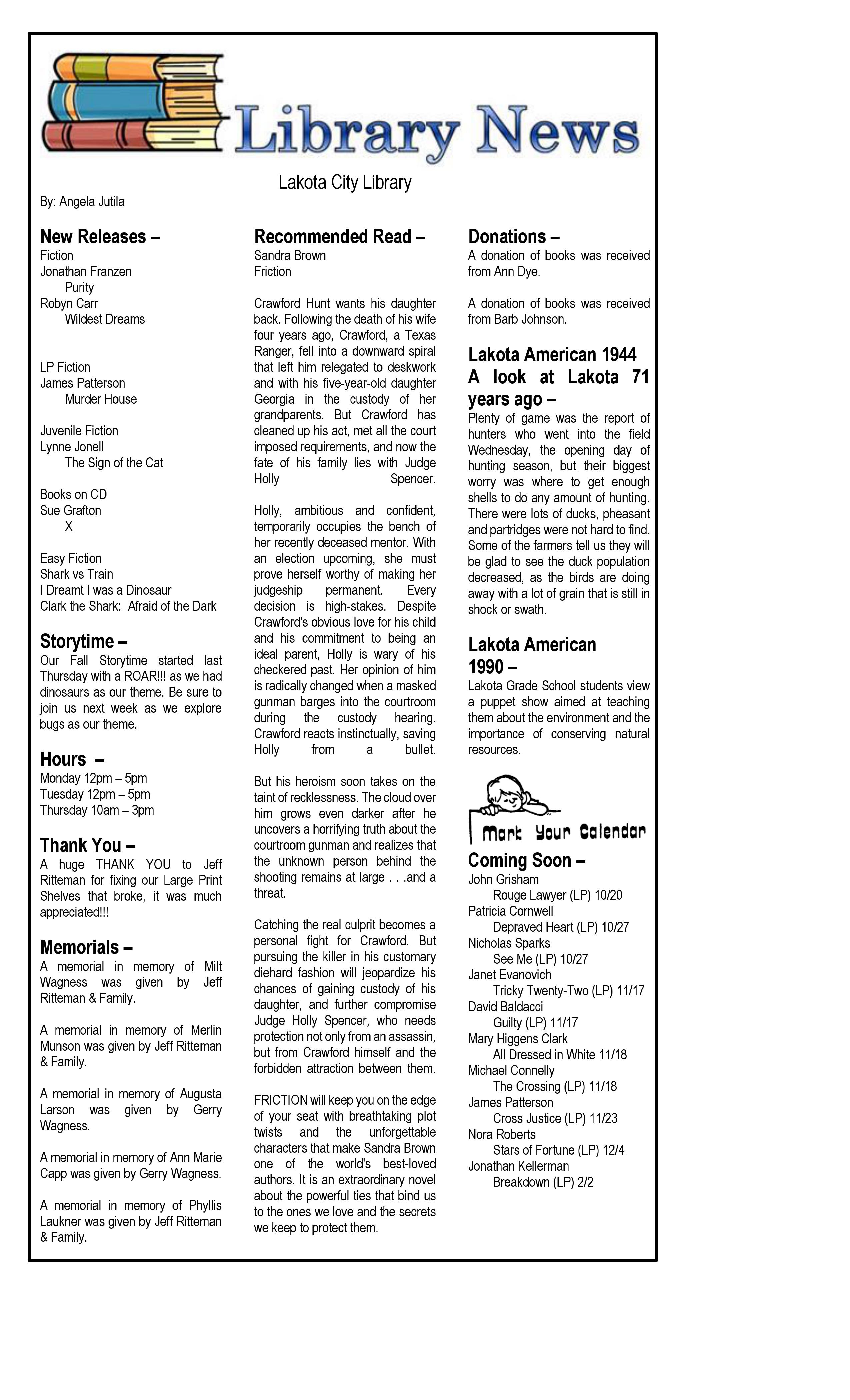 Newspaper Story – 10/6/15 Posted on October 8, 2015October 15, 2015 by lakotalibrary Share: Click to email a link to a friend (Opens in new window) Email TweetLike Loading... Related