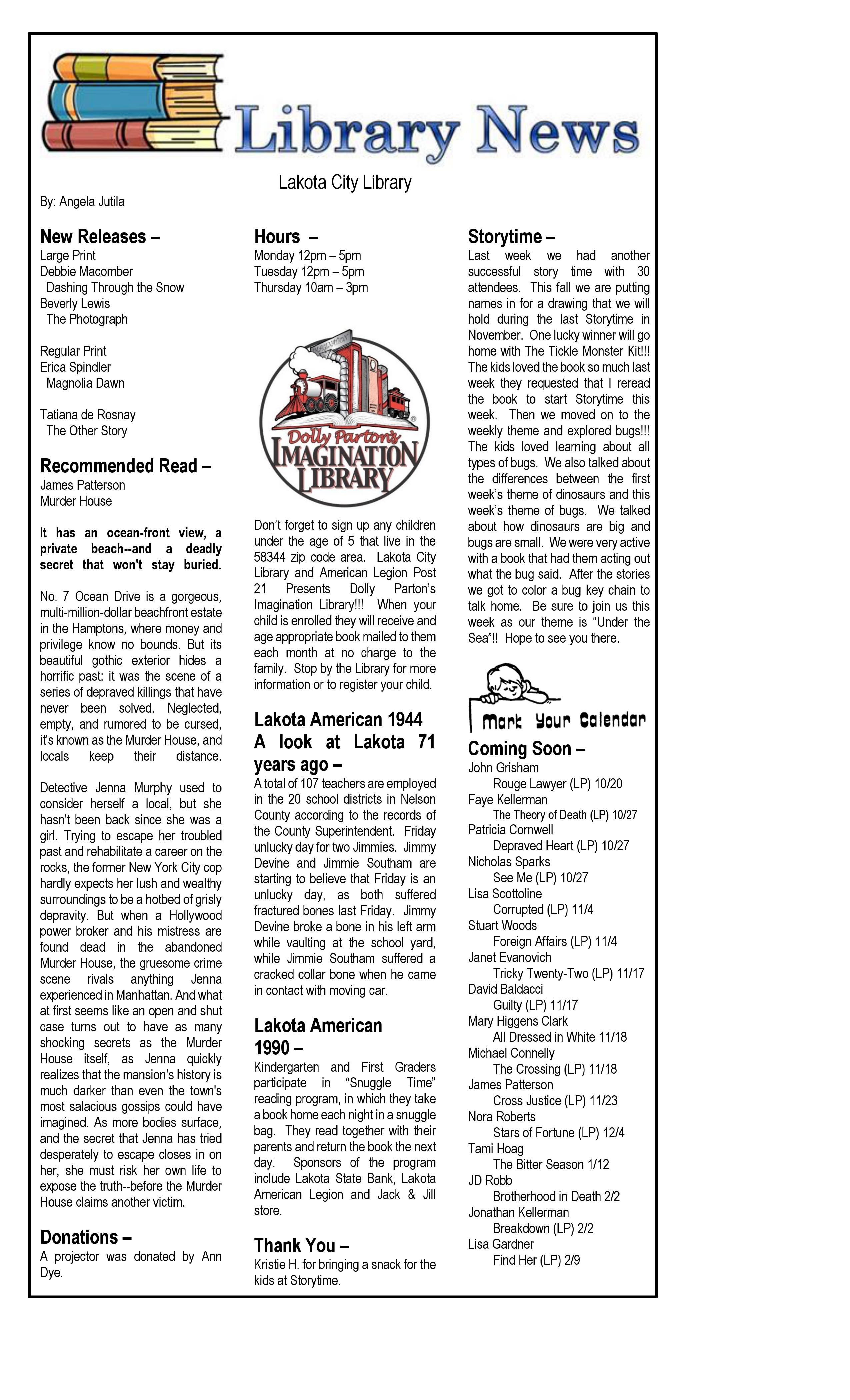 Newspaper Story – 10/13/15 Posted on October 15, 2015 by lakotalibrary Share: Click to email a link to a friend (Opens in new window) Email TweetLike Loading... Related
