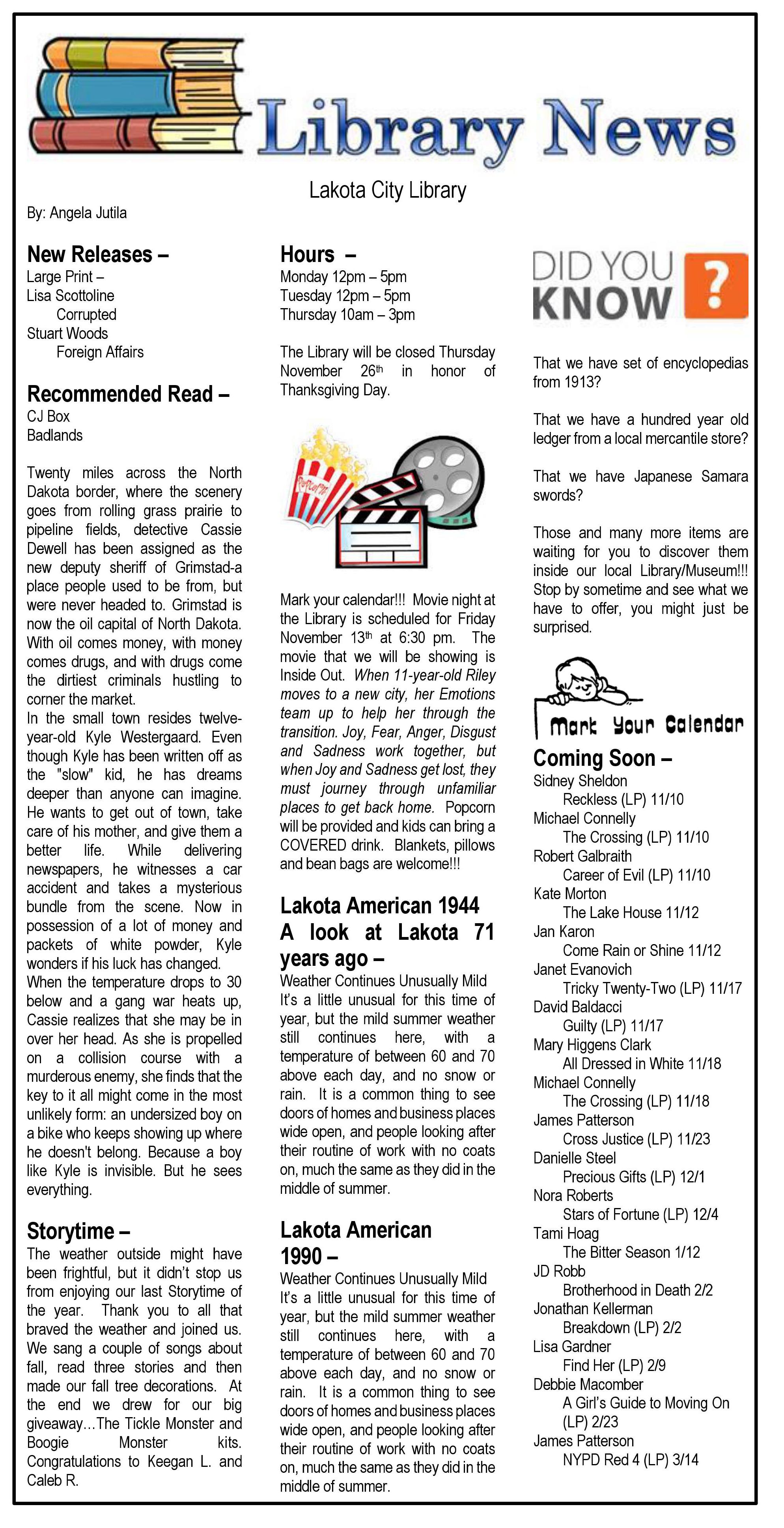 Newspaper Article – 11.9.15 Posted on November 12, 2015December 17, 2018 by lakotalibrary Share: Click to email a link to a friend (Opens in new window) Email TweetLike Loading... Related
