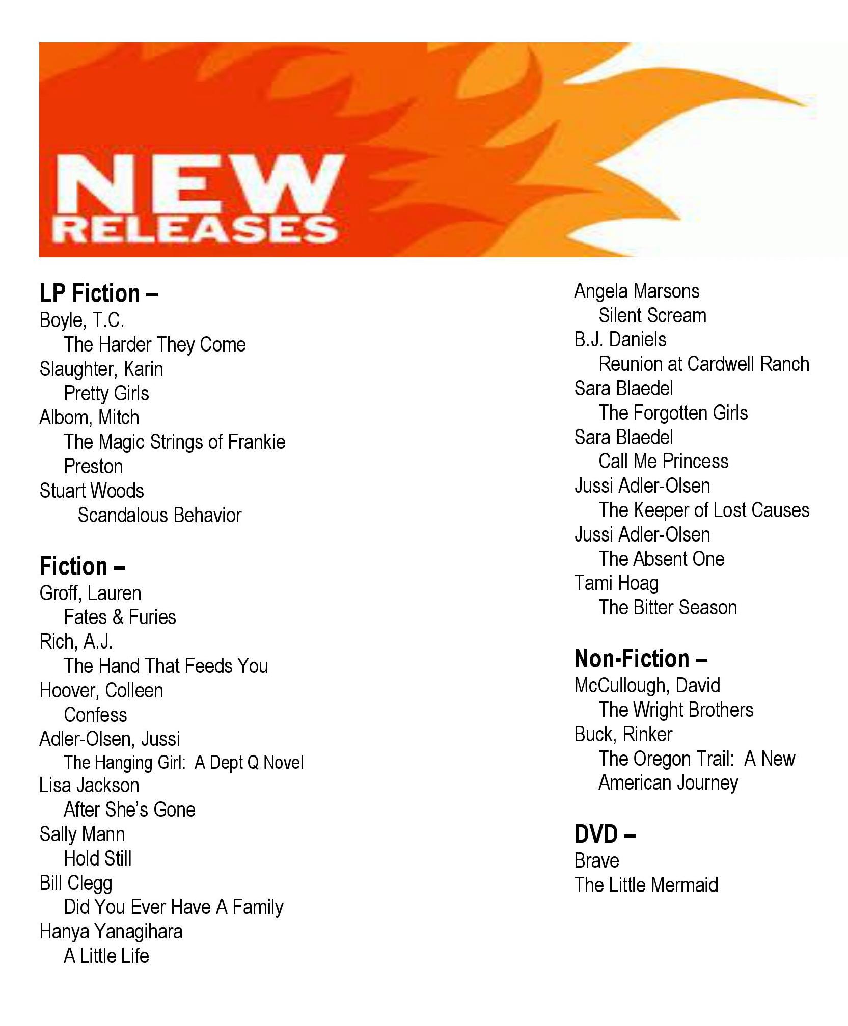 New Releases Posted on January 19, 2016 by lakotalibrary Share: Click to email a link to a friend (Opens in new window) Email TweetLike Loading... Related