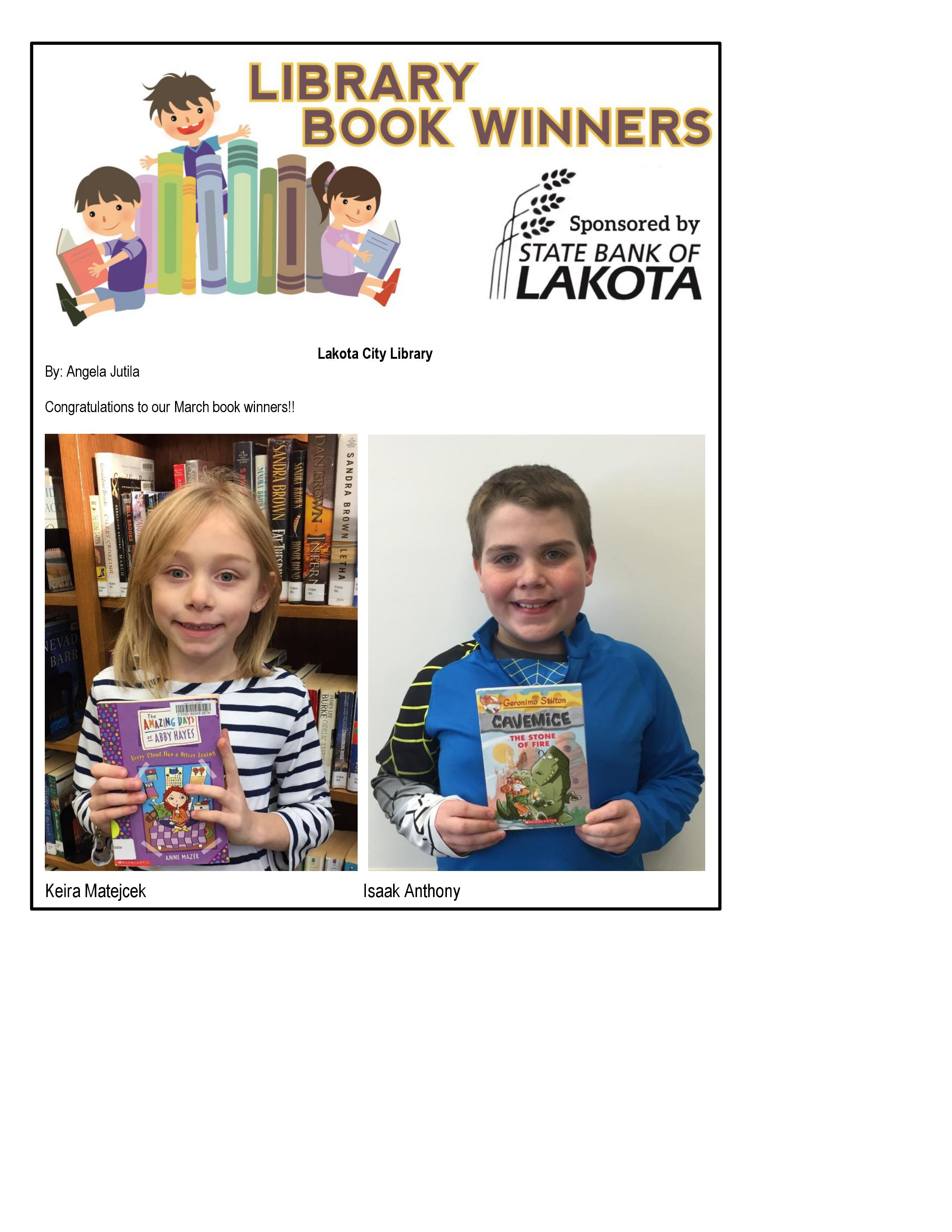 March Book Winners Posted on March 14, 2016March 14, 2016 by lakotalibrary Congratulations to Keira and Isaak for being our March book winners!! Share: Click to email a link to a friend (Opens in new window) Email TweetLike Loading... Related