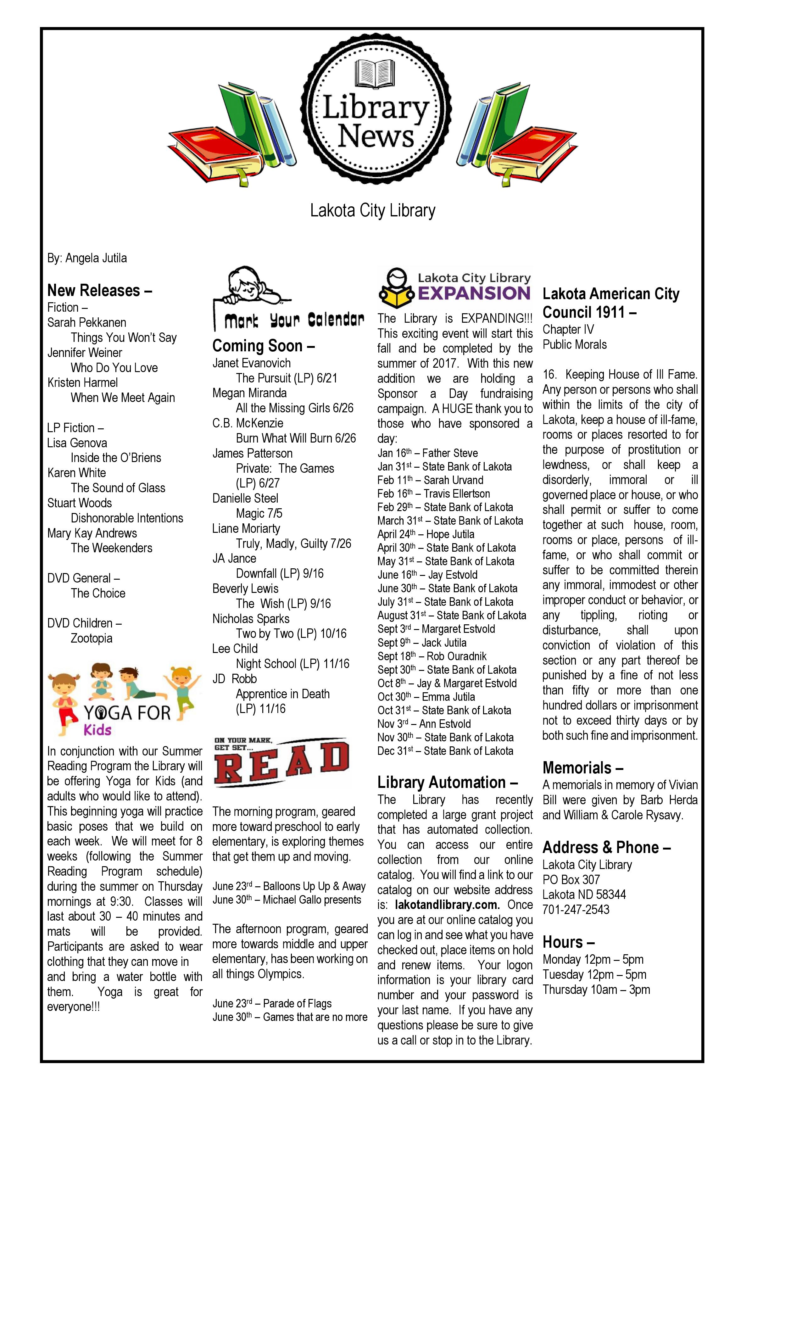 Newspaper Article 6.23.16 Posted on June 21, 2016 by lakotalibrary Share: Click to email a link to a friend (Opens in new window) Email TweetLike Loading... Related
