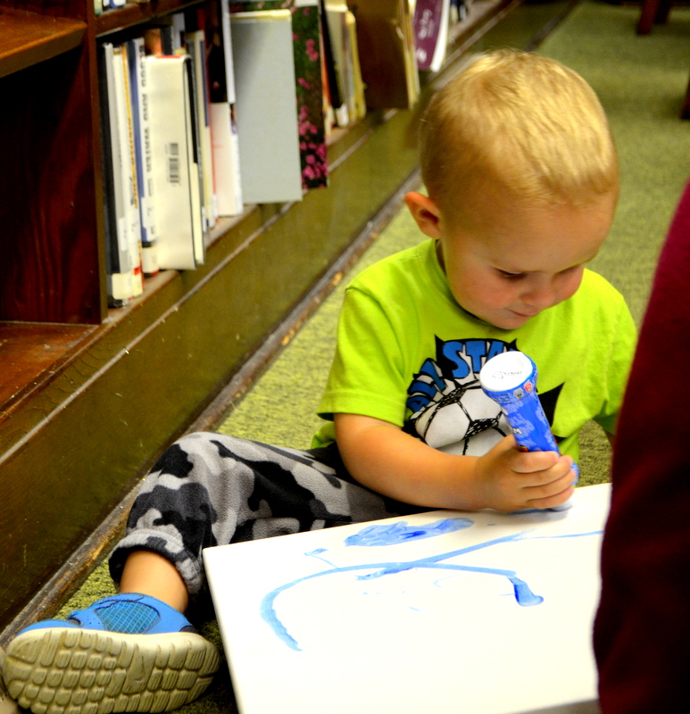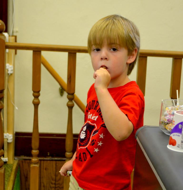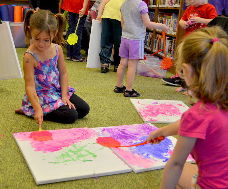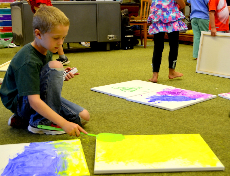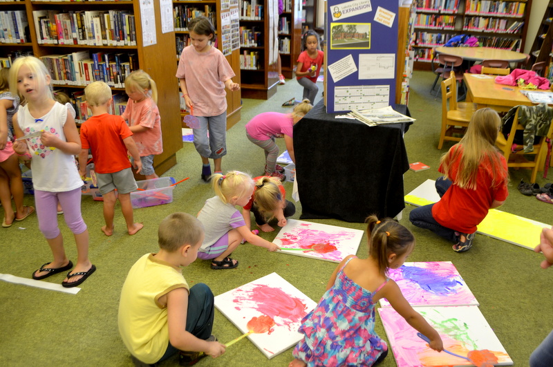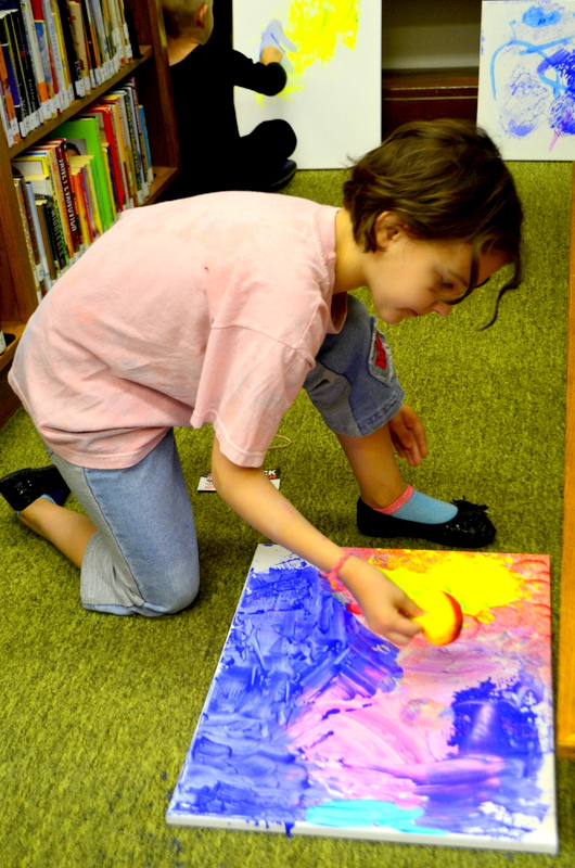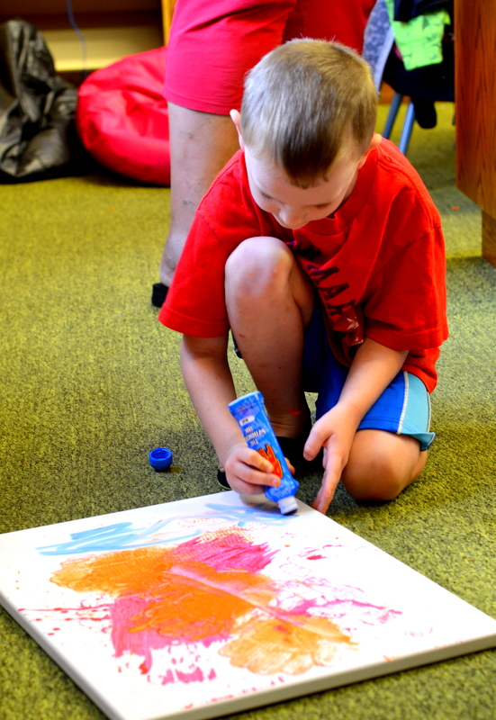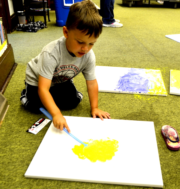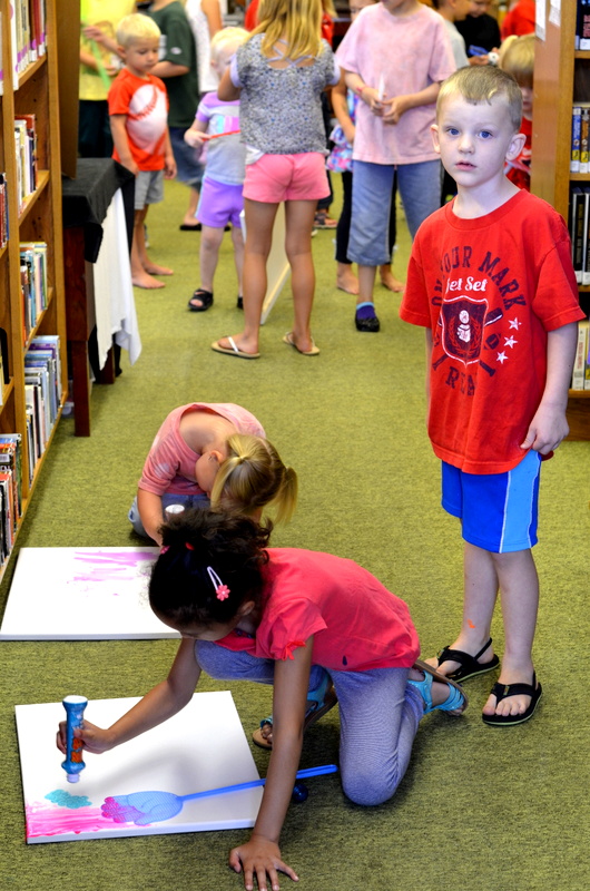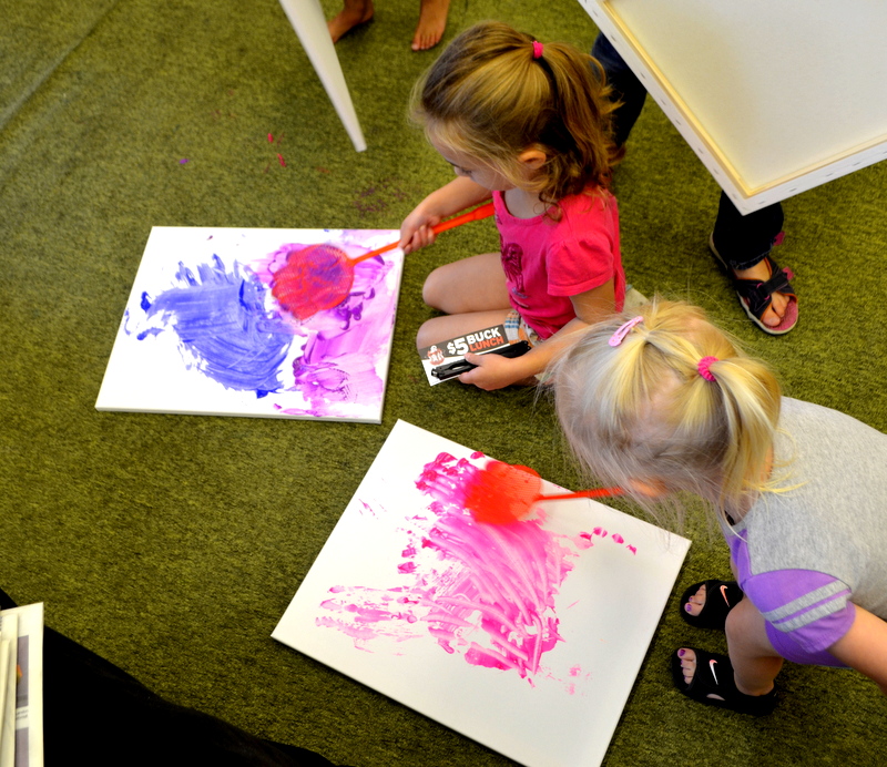 On August 4th we enjoyed the theme of Flying. The weather was pretty cool and damp so we held our activities inside. After a few stories the kids flew rockets threw some hoops to win sundaes and then it was time for the main event. The kids painted canvases with fly swatters!!! They had a ton of fun and didn’t make near the mess I thought they would.