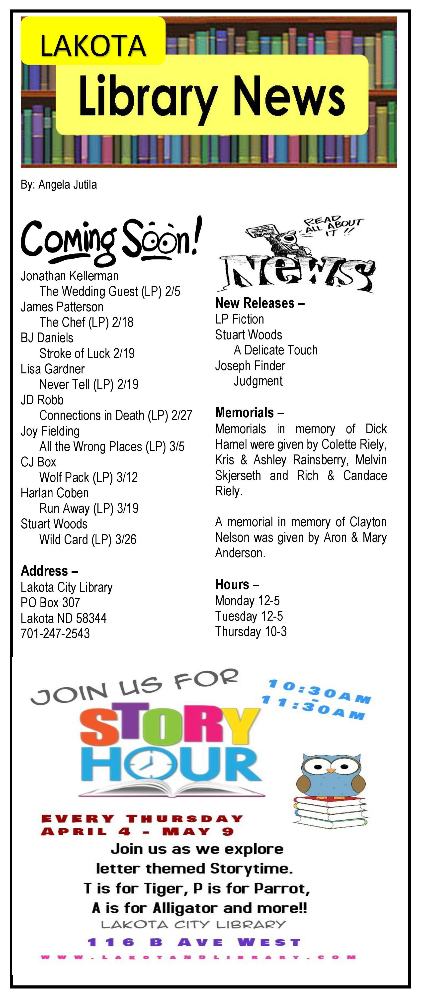 Newspaper Story 2.7.19 Posted on February 7, 2019 by lakotalibrary Share: Click to email a link to a friend (Opens in new window) Email TweetLike Loading... Related