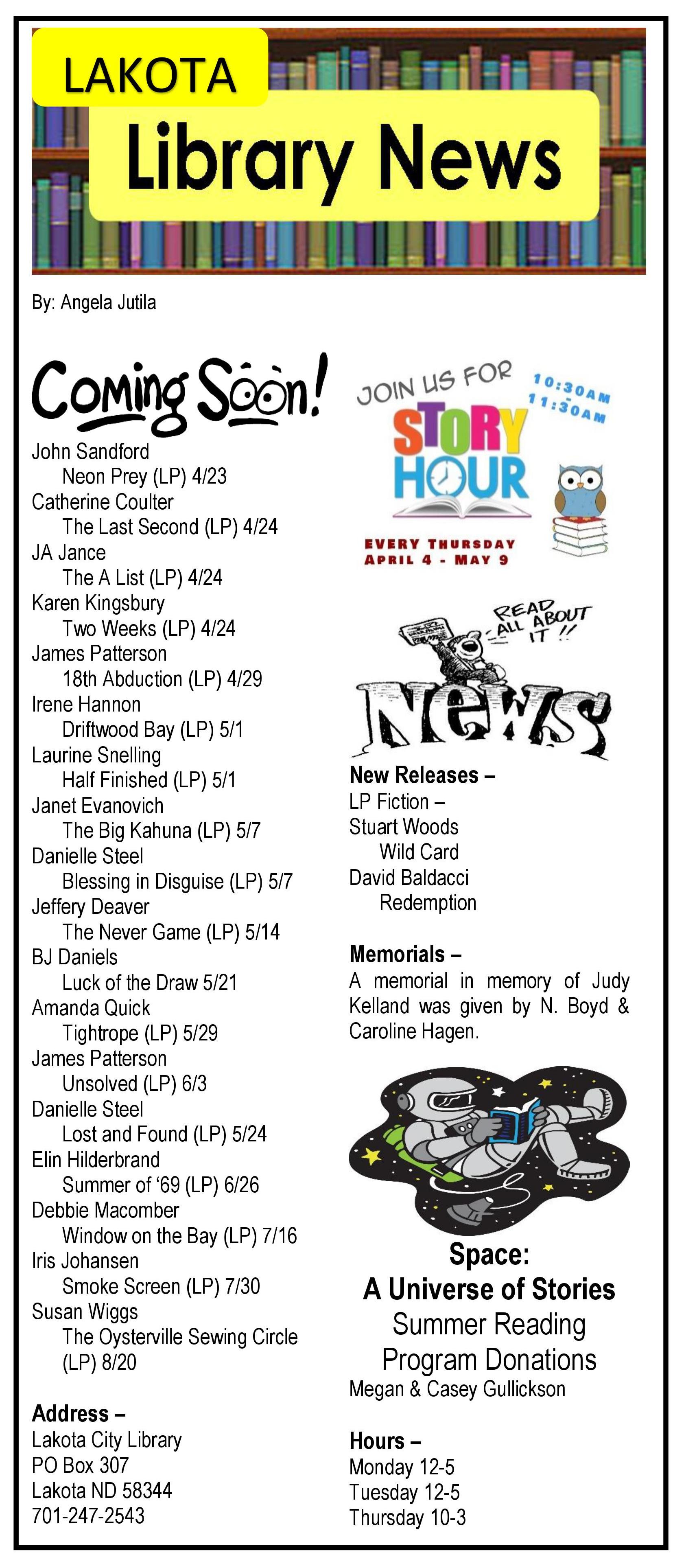 Newspaper Article 4.25.19 Posted on April 25, 2019May 9, 2019 by lakotalibrary Share: Click to email a link to a friend (Opens in new window) Email TweetLike Loading... Related