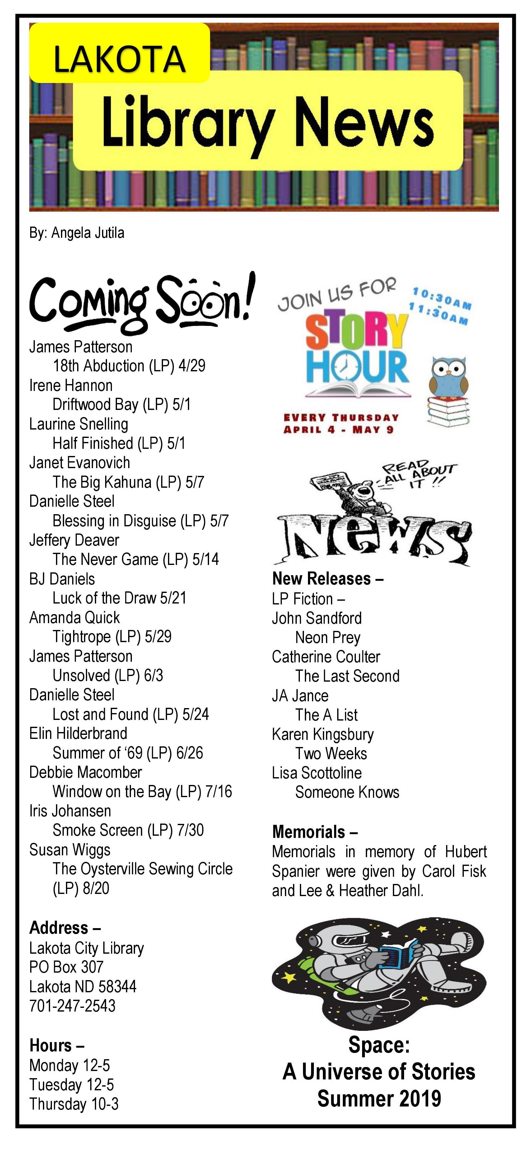 Newspaper Article 5.2.19 Posted on May 2, 2019April 25, 2019 by lakotalibrary Share: Click to email a link to a friend (Opens in new window) Email TweetLike Loading... Related