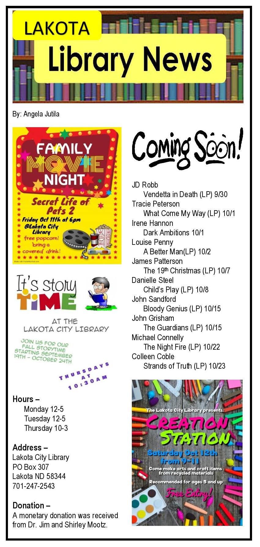 Newspaper Story 10.3.19 Posted on October 3, 2019September 30, 2019 by lakotalibrary Share: Click to email a link to a friend (Opens in new window) Email TweetLike Loading... Related