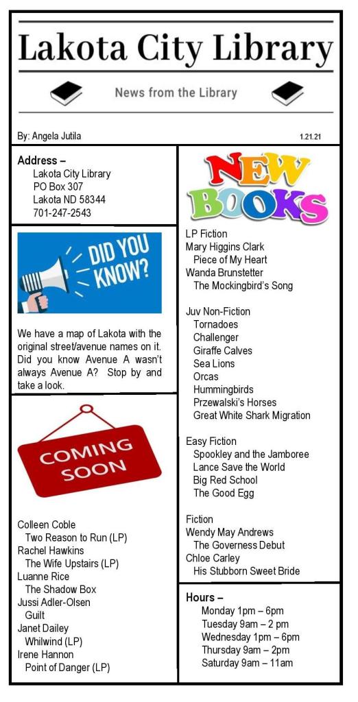 Newspaper Article 1.21.21 Posted on January 21, 2021 by lakotalibrary Share: Click to email a link to a friend (Opens in new window) Email TweetLike Loading... Related