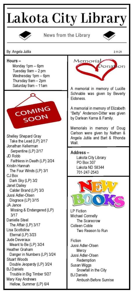 Newspaper Article 2.11.21 Posted on February 15, 2021 by lakotalibrary Share: Click to email a link to a friend (Opens in new window) Email TweetLike Loading... Related