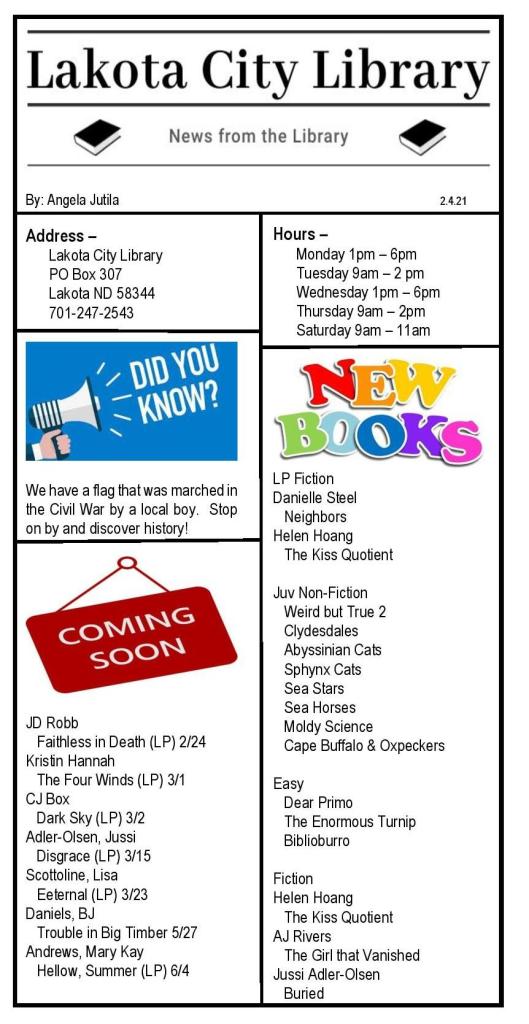 Newspaper Article 2.4.21 Posted on February 15, 2021 by lakotalibrary Share: Click to email a link to a friend (Opens in new window) Email TweetLike Loading... Related
