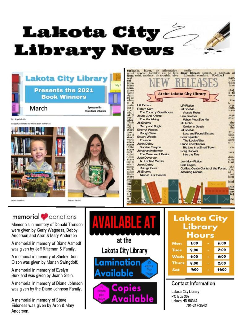Newsletter – March 2021 Posted on March 1, 2021February 25, 2021 by lakotalibrary Share: Click to email a link to a friend (Opens in new window) Email TweetLike Loading... Related