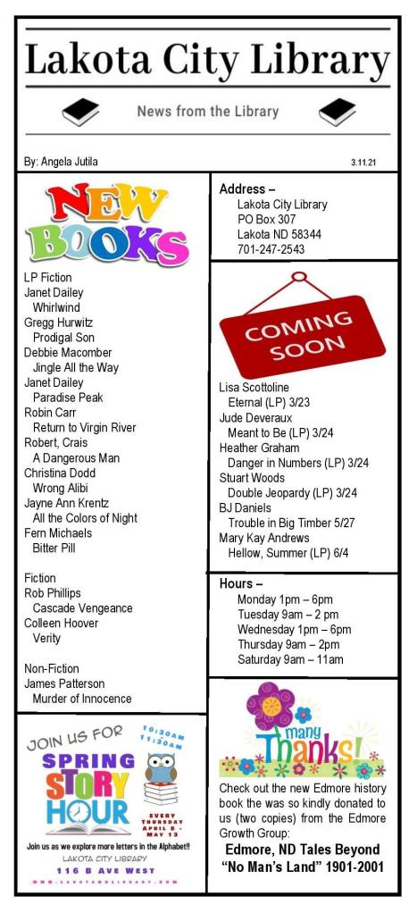 Newspaper Article 3.11.21 Posted on March 18, 2021 by lakotalibrary Share: Click to email a link to a friend (Opens in new window) Email TweetLike Loading... Related