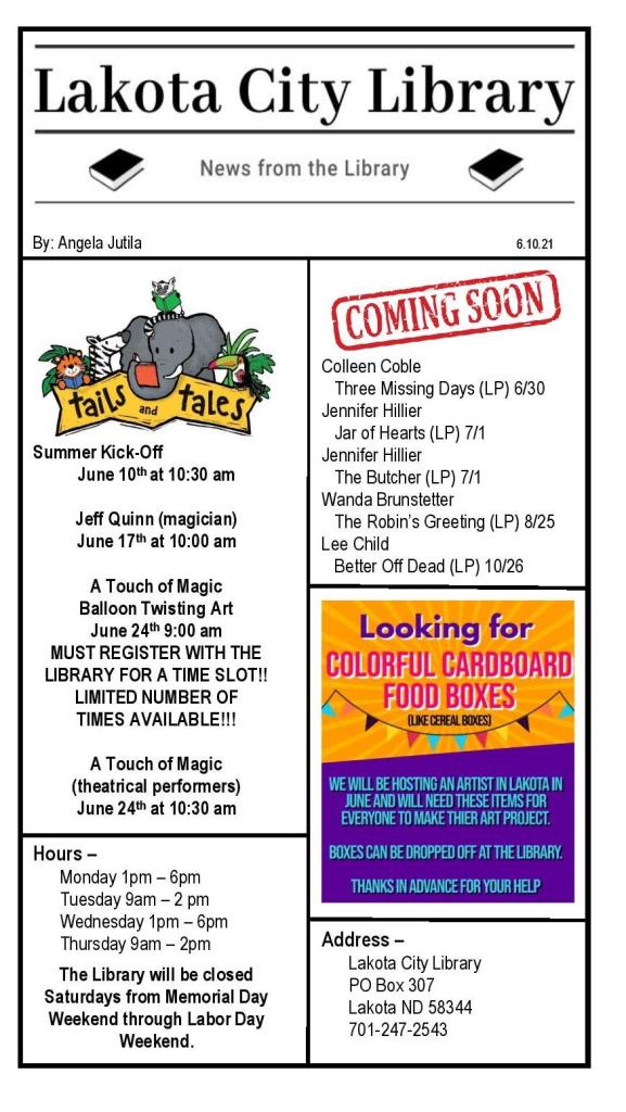 Newspaper Article 6.10.21 Posted on June 12, 2021June 10, 2021 by lakotalibrary Share: Click to email a link to a friend (Opens in new window) Email TweetLike Loading... Related