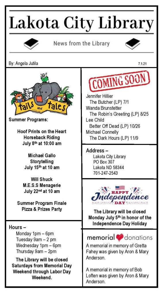 Newspaper Article 7.1.21 Posted on June 30, 2021June 28, 2021 by lakotalibrary Share: Click to email a link to a friend (Opens in new window) Email TweetLike Loading... Related