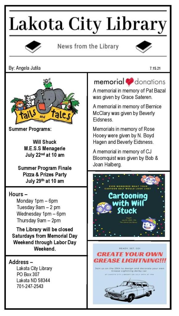 Newspaper Article 7.15.21 Posted on July 15, 2021July 12, 2021 by lakotalibrary Share: Click to email a link to a friend (Opens in new window) Email TweetLike Loading... Related