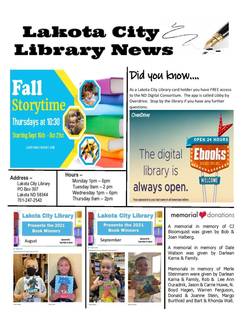 September Newsletter Posted on September 1, 2021August 26, 2021 by lakotalibrary Share: Click to email a link to a friend (Opens in new window) Email TweetLike Loading... Related