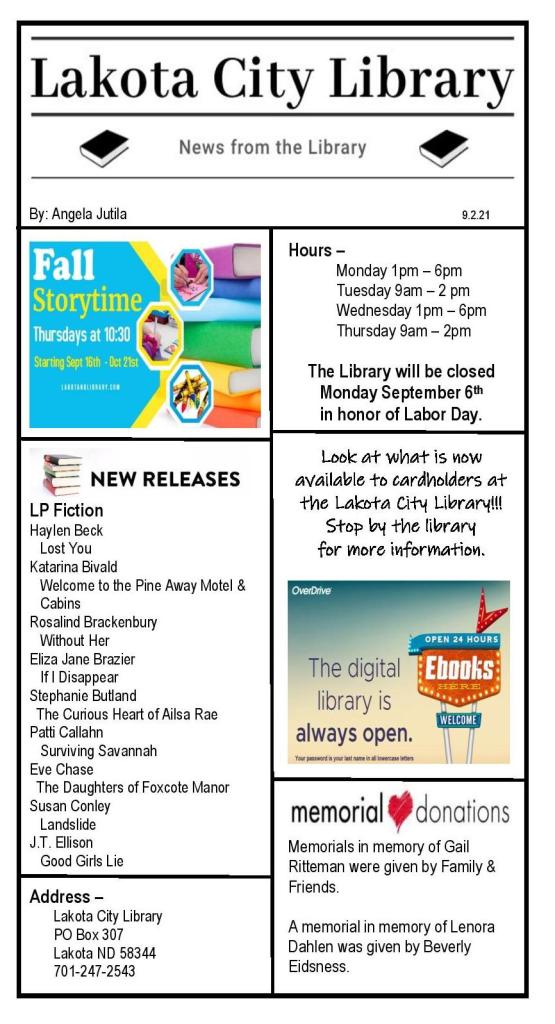 Newspaper Article 9.2.21 Posted on September 2, 2021August 26, 2021 by lakotalibrary Share: Click to email a link to a friend (Opens in new window) Email TweetLike Loading... Related