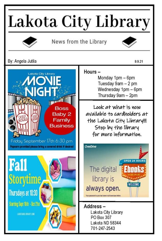 Newspaper Article – 9.9.21 Posted on September 9, 2021September 9, 2021 by lakotalibrary Share: Click to email a link to a friend (Opens in new window) Email TweetLike Loading... Related