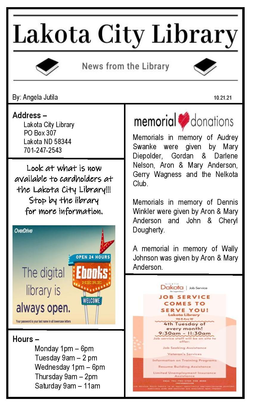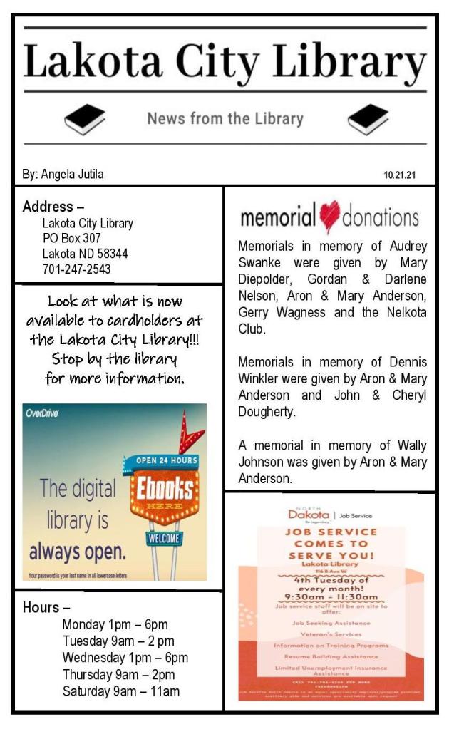 Newspaper Story 10.21.21 Posted on November 7, 2021 by lakotalibrary Share: Click to email a link to a friend (Opens in new window) Email TweetLike Loading... Related