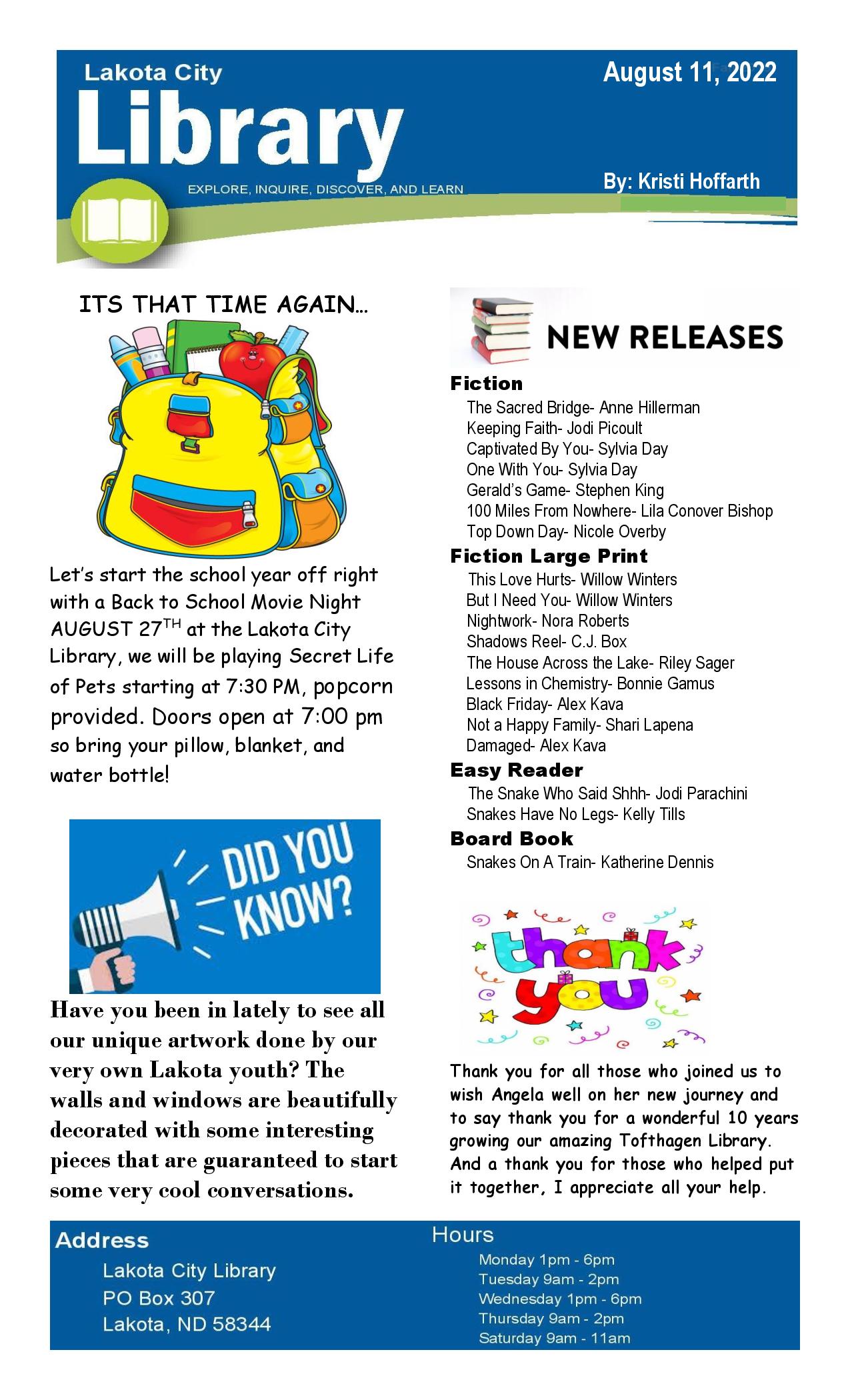 Newspaper Article 8/11/22 Posted on August 11, 2022August 9, 2022 by lakotalibrary Share: Click to email a link to a friend (Opens in new window) Email TweetLike Loading... Related