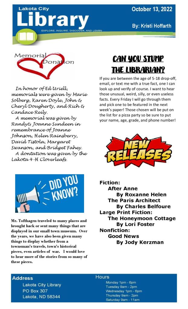 Newspaper Article 10/13/22 Posted on October 13, 2022October 13, 2022 by lakotalibrary Share: Click to email a link to a friend (Opens in new window) Email TweetLike Loading... Related